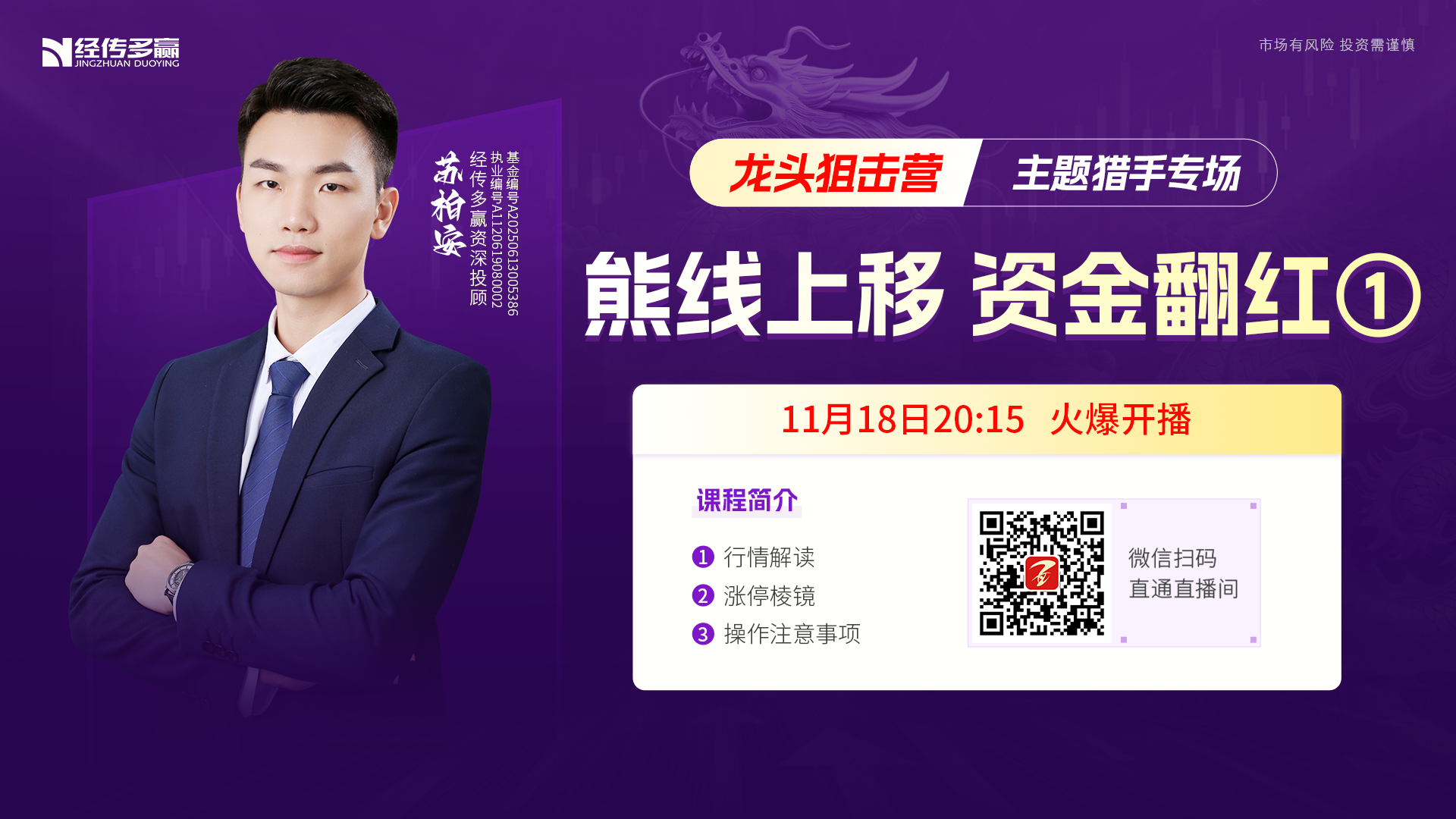经传多赢短线王 职业编号:A1120619100003, 本圈子是由投研总监杨春虎,携多位人气投顾打造的短线王专属学习交流圈。 【1】提供直播教学指导:短线王指标精讲、短线王战法精讲、实战案例讲解 【2】三对一全方位服务:由投顾、讲师、服务老师一体化的专业团队提供全程服务跟踪 杨春虎,执业编号:A1120619100003 罗雪奎,执业编号:A1120616080001 吴中明,执业编号:A1120613090002 孙硌,执业编号:A1120616090005