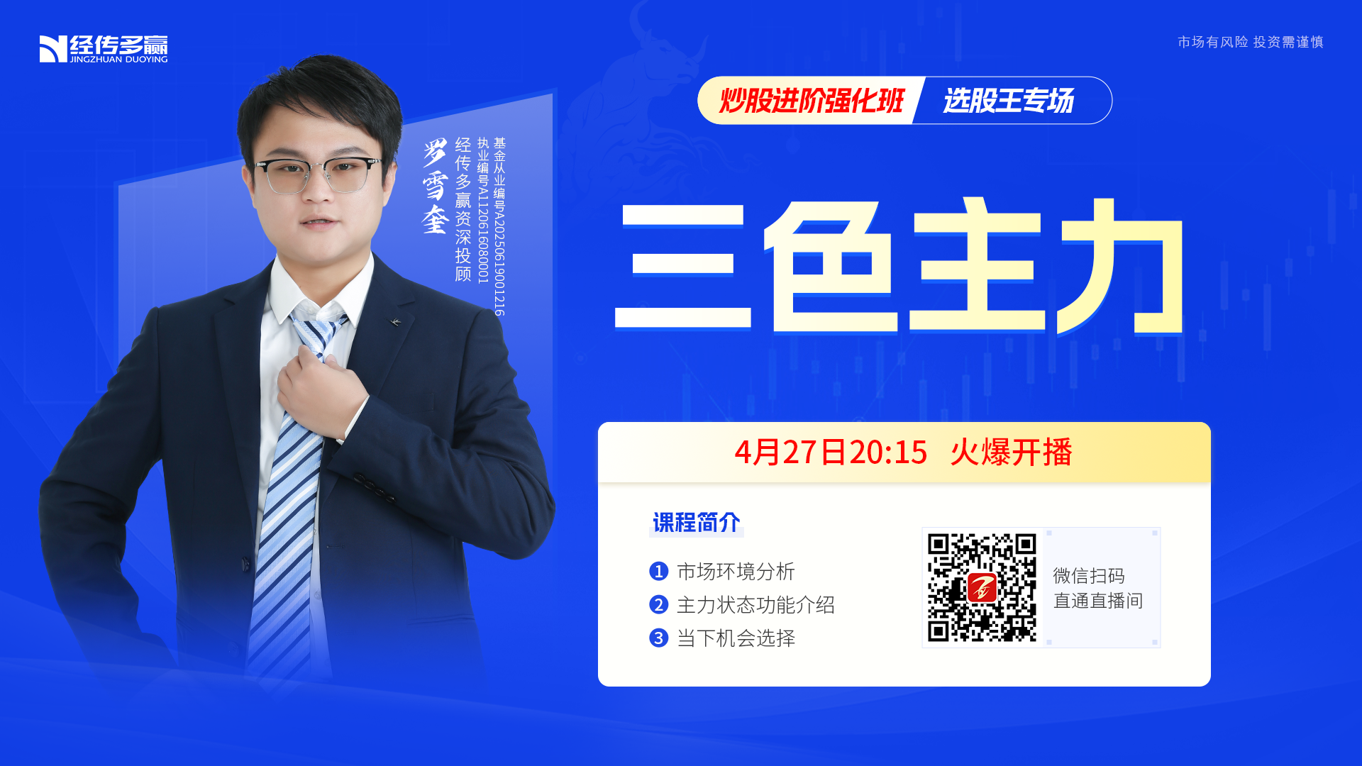 罗雪奎 职业编号:A1120616080001, 罗雪奎,十四年证券市场经验,本科金融主修,个人独创《三阳开泰》《超级买入法》《风口T+3》 配合短线买卖,独创《穿越牛熊九套战法》,精准预判每个阶段市场特征制定最优交易策略。