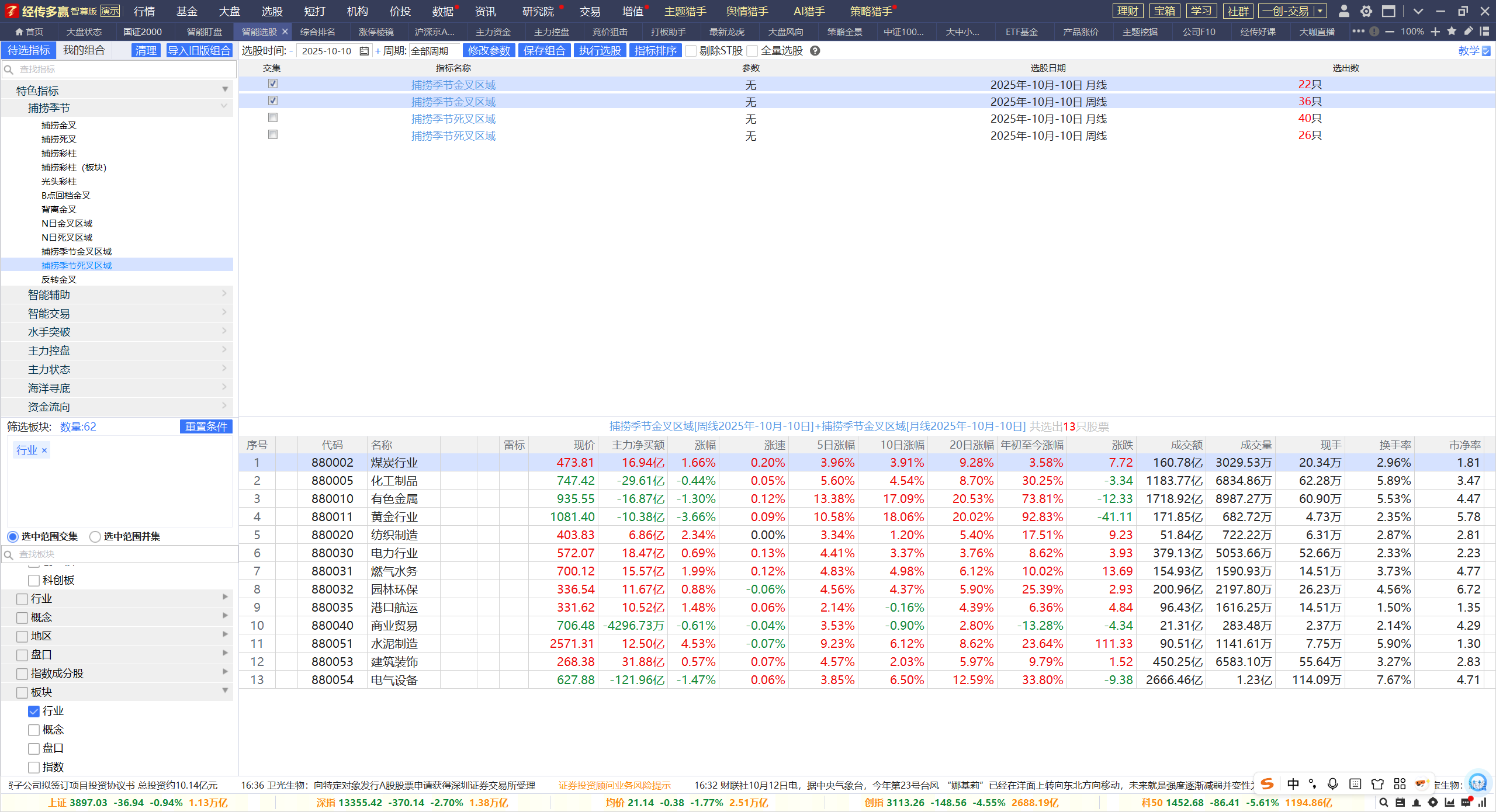 1,指数中短期来看,月线金叉区域21支,死叉区域9支,相当于三分之二的指数,看起来依然是强势区域,但需要注意,死叉的是本月刚死叉,金叉区域的,则是已经多个周期,属于金叉末端,也就是鱼尾行情。所以月线角度数据统计的结论是,大部分的指数都会在四季度陆续进入死叉区域,指数一旦进入月线死叉区域,带给我们的热点的持续度会减少,面对市场的操作,就要更加坚持波段为王,也就是机会没有金叉区域的那么久,持股严格执行交易信号,交易容错率急剧下降,