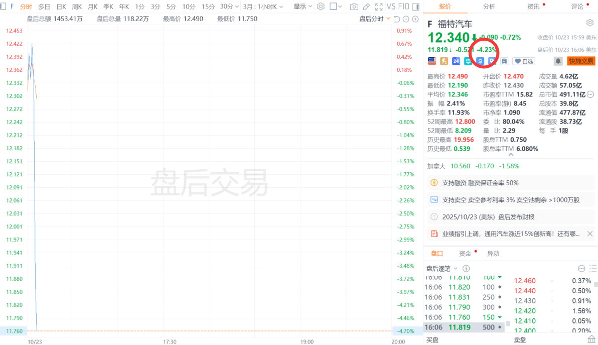 财联社10月24日电,福特美股盘后股价涨超5%,此前一度下跌5.6%。
