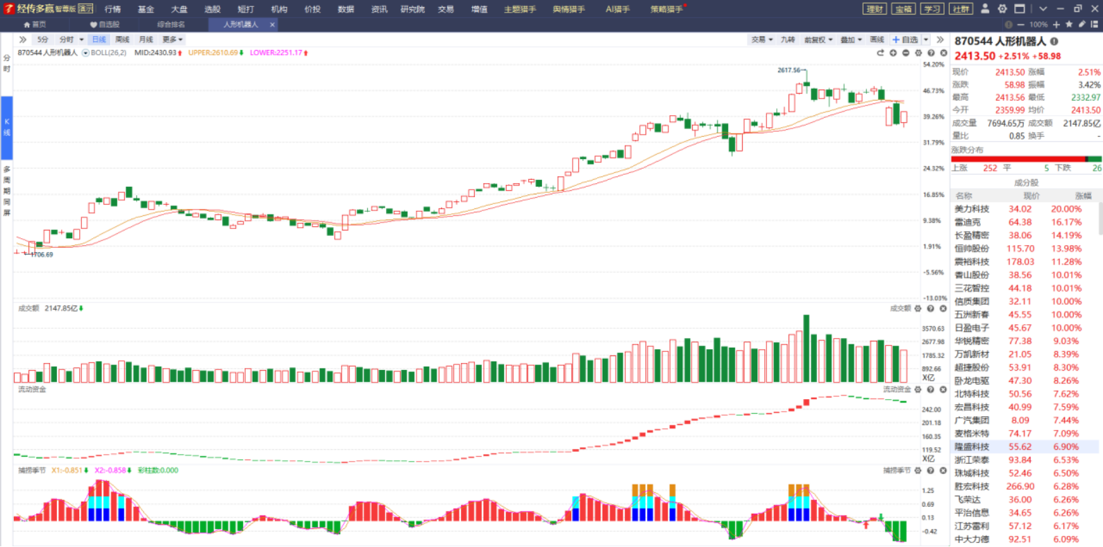 人形机器人板块昨天的反弹力度很强,有想要突破辅助线压制的劲头,不过目前它的指标并不好,成交量呈持续缩量状态,流动资金持续翻绿,捕捞季节继续收出死叉,可以先关注一下,耐心等待趋势好转再介入。