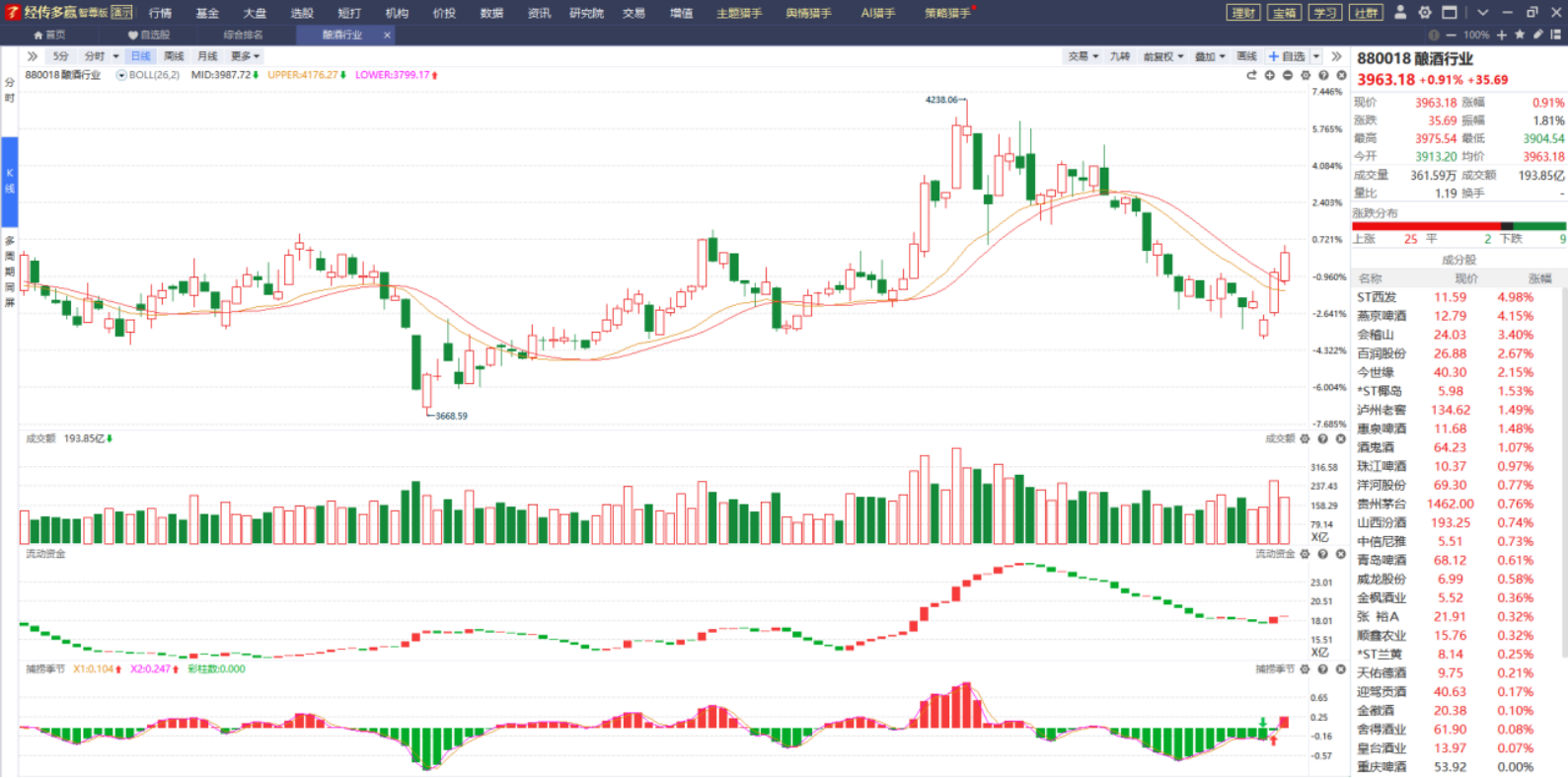 酿酒板块逐渐从底部止跌企稳,目前它的趋势跟指标都逐渐好转,K线站在智能辅助线上方,流动资金持续两天翻红,捕捞季节刚刚收出金叉,而且酿酒板块还有一个优势就是位置比较低,倒不失为一个好的介入时机,感兴趣的可以参与一下。