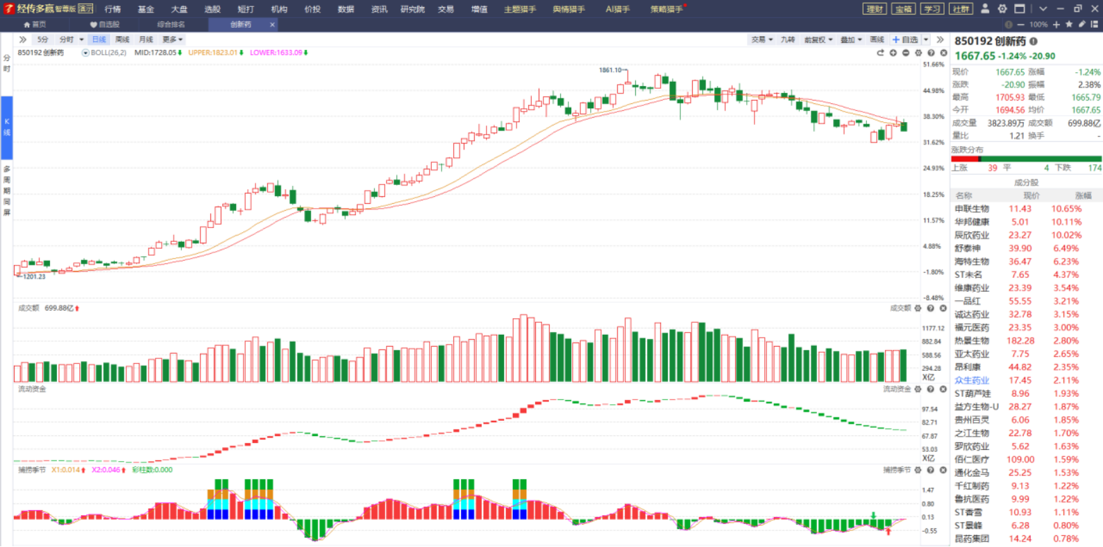 创新药经过前面几次的反弹有点止跌企稳的迹象,捕捞季节率先收出金叉,不过目前它仍面临着智能辅助线的压制以及指标未见明显好转的风险,可先关注一下,等趋势好转再介入。