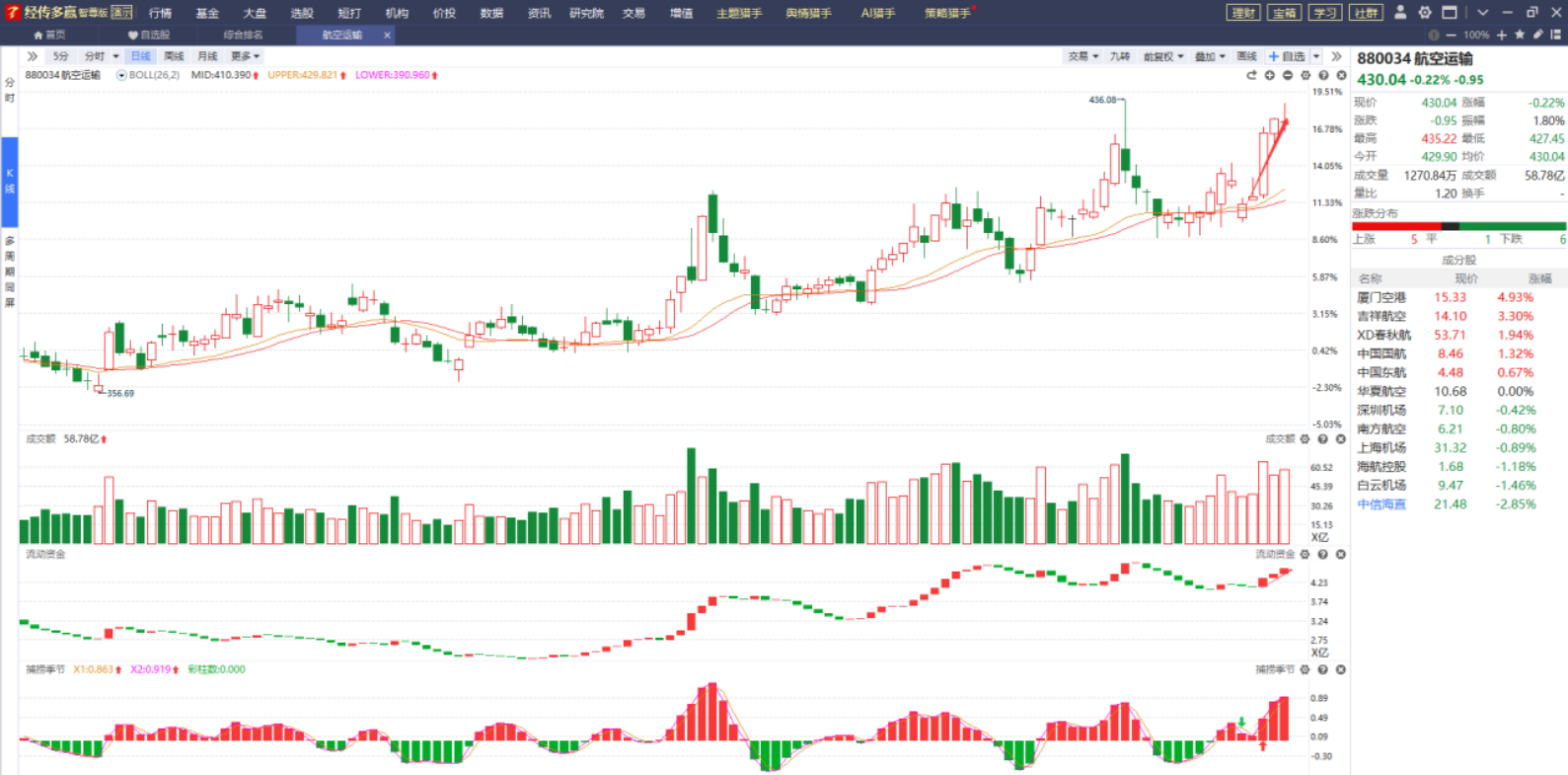 航空运输板块近期的走势非常不错,能在这种大环境不好的背景下走出趋势行情已经实属不易了,目前它的成交量保持得不错,流动资金翻红,捕捞季节呈金叉状态,可持续关注,但切勿追高,经过一段时间的上涨,它现在面临前期冲高回落的长上引线的压力,是否会再次遇压回落还面临着不小的考验。