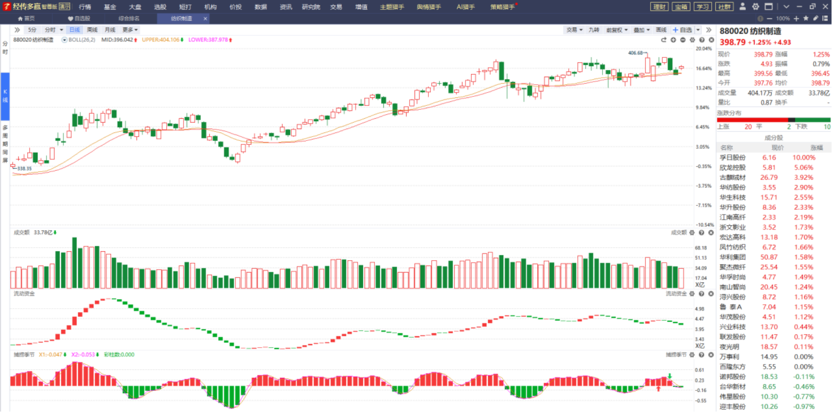 纺织制造板块的表现不能说很强但也不差,整体处在智能辅助线上方震荡,其实随着近期科技一直没有很好的表现,反倒是让一些“小而美”的板块迎来了不错的上涨行情,如果此时你的布局方向错了,有可能就会让这些不经意的收益从你的手缝溜走,所以如果你真的没有什么好的选择,不妨把目光转移到你平时不怎么留意的方向上来。