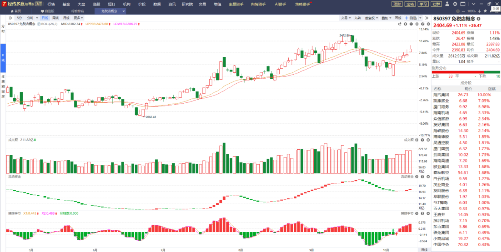 免税店概念近期的趋势非常不错,成交量呈放量状态,流动资金持续翻红,捕捞季节收出金叉,目前趋势跟指标的表现都非常不错,可以持续关注,唯一需要注意的就是连续的上涨行情之后存在调整的可能,要注意回调风险。