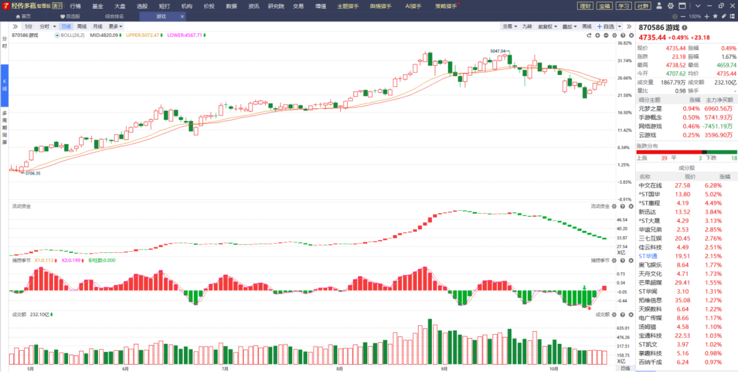 游戏板块止跌企稳后慢慢从底部爬升起来,并且有站稳智能辅助线的趋势,捕捞季节收出金叉,但成交量跟流动资金并没有好转,先继续保持观望吧!让它站稳辅助线的趋势更稳一些,然后有更多好转信号出现。