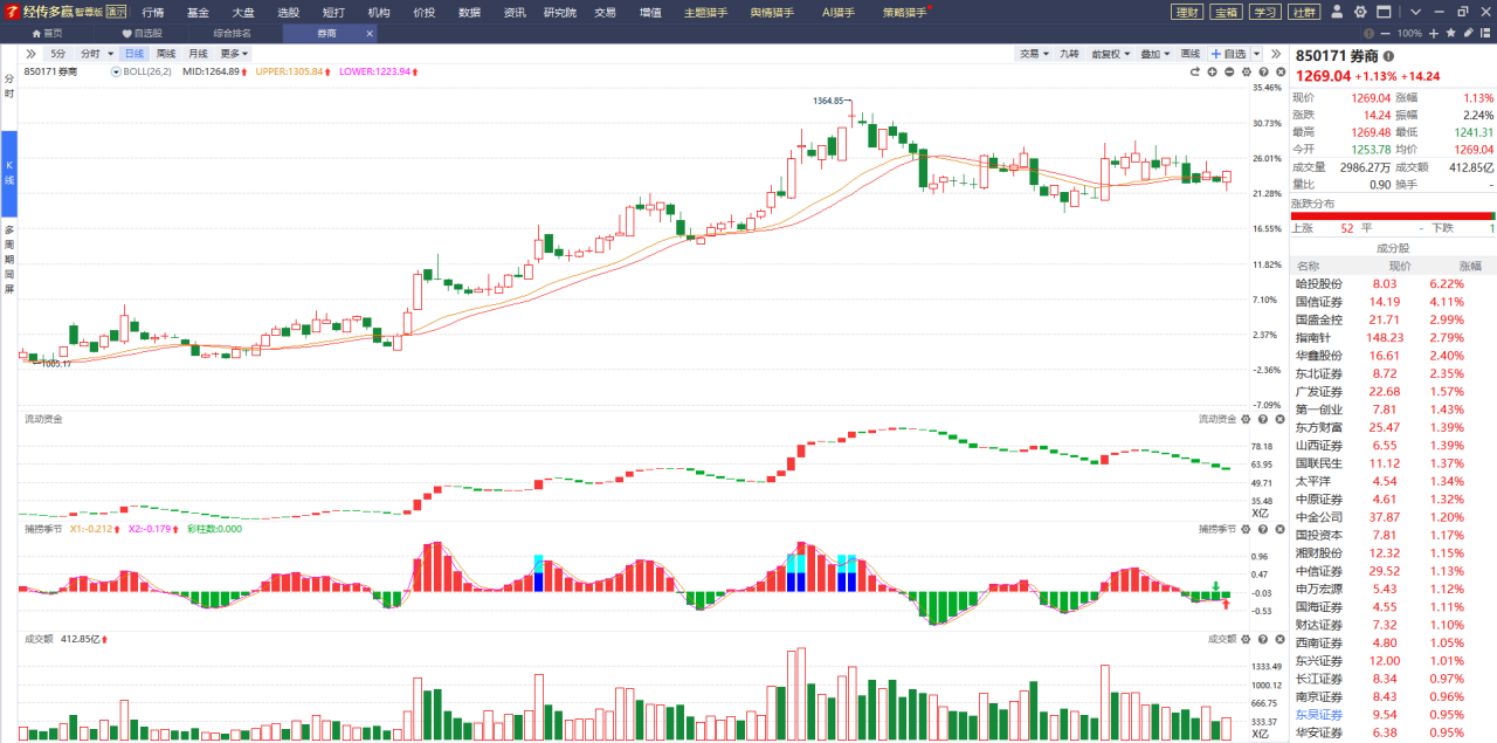 指数横盘震荡了很久,随着时间的推移它慢慢有点企稳的迹象,指数长时间震荡都没跌下来,那就意味着它后续上涨的概率比较大,而指数一旦上涨必然会推动券商板块的异动,从券商板块的指标来看,目前仅有捕捞季节收出了金叉,流动资金跟成交量没有明显好转,继续保持观望!