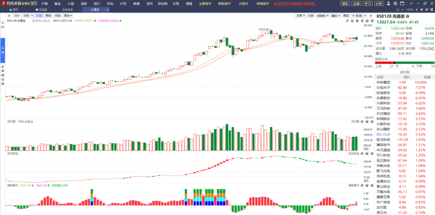 光通信板块沿着智能辅助线窄幅震荡,趋势不算很强只能说勉勉强强,成交额没有明显的放量,流动资金呈持续翻绿状态,捕捞季节已经收出死叉,接下来就看它能否继续在智能辅助线上方得到支撑,因为现在的行情非常不稳定,什么样的行情都会出现,所以还需要保持谨慎。