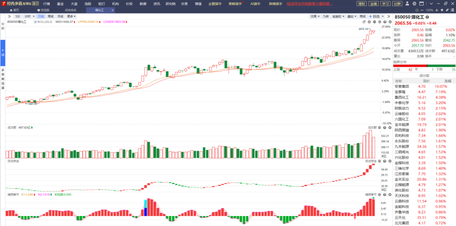 从煤化工的走势就能发现市场现在的资金布局的方向仍然在权重周期股方向,虽然它的当天涨幅不大但架不住它持续的时间长,长时间保持这种上涨状态,一旦时间拉长了也会有不错的收益,现在唯一担心的就是它短期涨幅过大面临着调整的可能,除此之外其他方向都还是不错的。