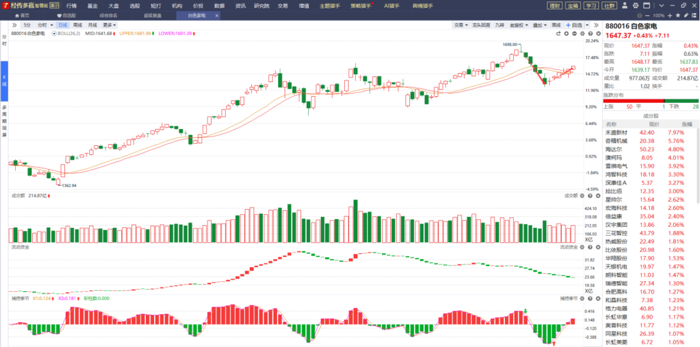 家电板块近期的走势非常不错,从底部止跌企稳展开反弹并强势突破辅助线的压制,捕捞季节收出金叉,但流动资金跟成交量的表现稍微差一点,对该方向感兴趣的倒是可以关注一下。