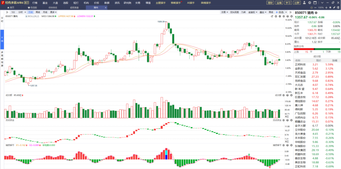 猪肉板块在底部止跌企稳,但现在它面临辅助线的压制,成交量呈放量状态,流动资金翻红,捕捞季节收出金叉,趋势跟指标都有好转的迹象,随着“双节”的来临,猪肉有望迎来不错的业绩窗口期,鉴于它所处的位置也比较低,是不错的低吸机会。