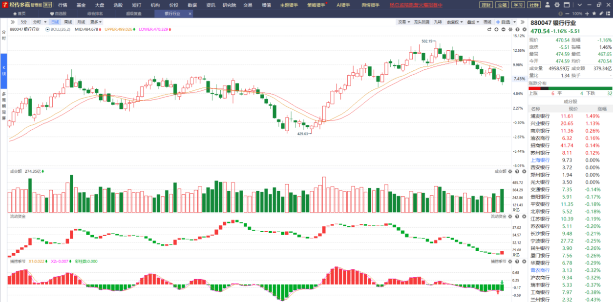 银行板块进入下降通道,成交量稍有放量,流动资金翻红,但它被智能辅助线牢牢压制,捕捞季节也收出死叉,短期看它能否重新站上智能辅助线,站上再做下一步打算,不站上不关注。