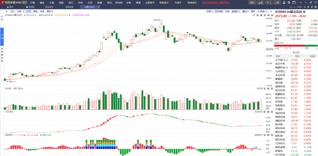 AI算力虽然趋势不是特别好,但它起码能站在智能辅助线上方,成交量也呈逐级放量的状态,流动资金持续翻红,只要不跌破辅助线的支撑可轻仓介入,耐心等待趋势进一步好转以及更多积极的信号出现。