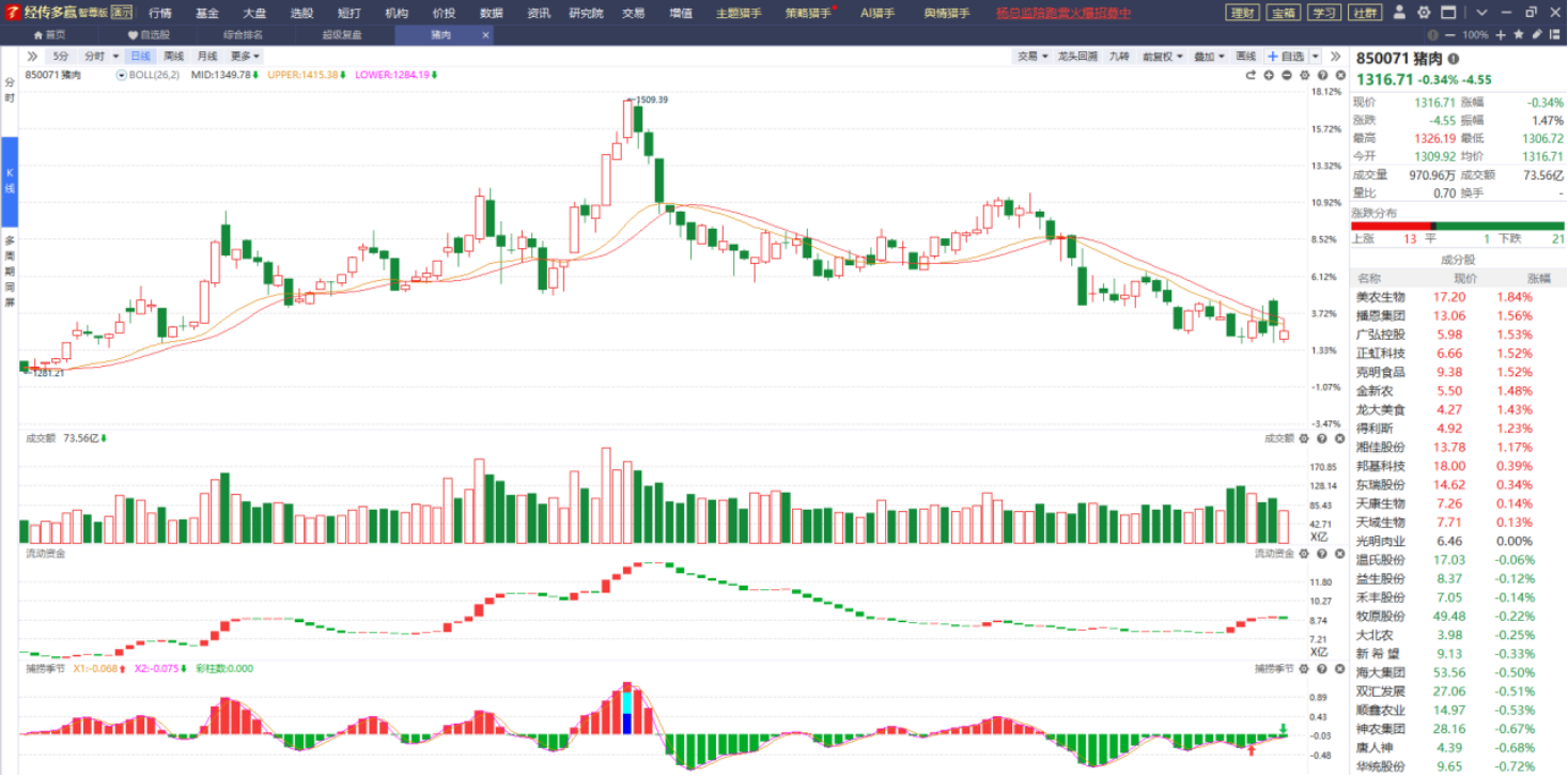 猪肉板块有从底部止跌企稳的迹象,不过由于它的各项指标都没有出现好转的迹象,有可能会进一步下探,所以不站上智能辅助线不做过多的关注,站上之后再考虑布局。
