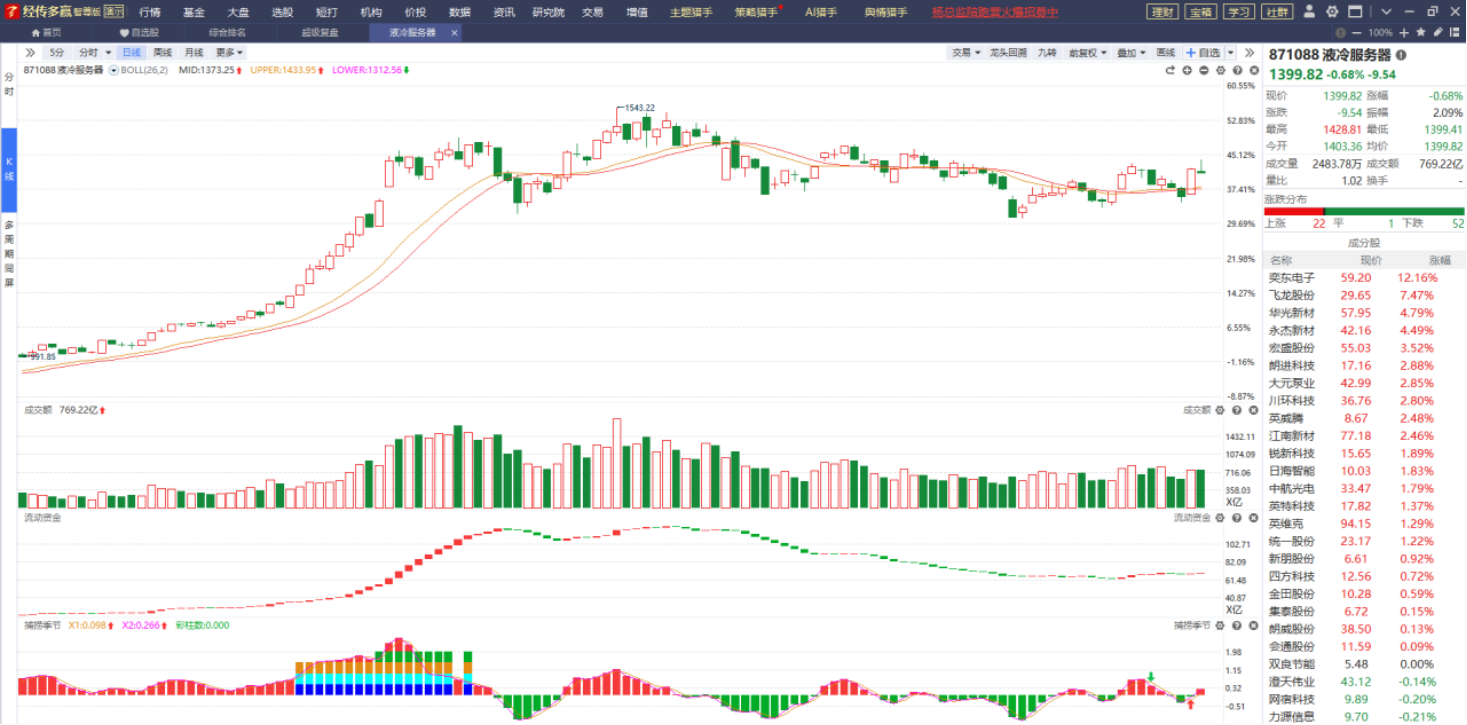 液冷服务器趋势有所好转,流动资金持续翻红,捕捞季节收出金叉,成交量保持得不错,不过它昨天盘中的冲高回落也给后面的行情带来了不确定性,现在市场仍处在震荡的节奏,板块涨一天跌一天很正常,真的对某一个方向感兴趣可以在调整时介入,现在市场上除了几个主线方向能保持连涨节奏之外,其他板块很难持续上涨。