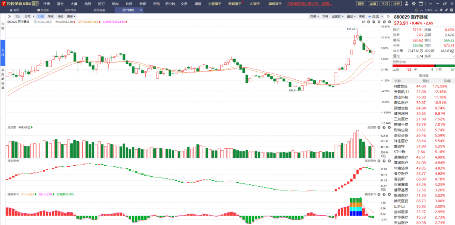 医疗器械板块昨天小幅反弹,但各项指标均没有出现好转的迹象,流动资金持续翻绿,成交量也没有明显放量,捕捞季节也仍然在死叉状态,这意味着它有继续下探的可能,关注回档金叉的投资机会。