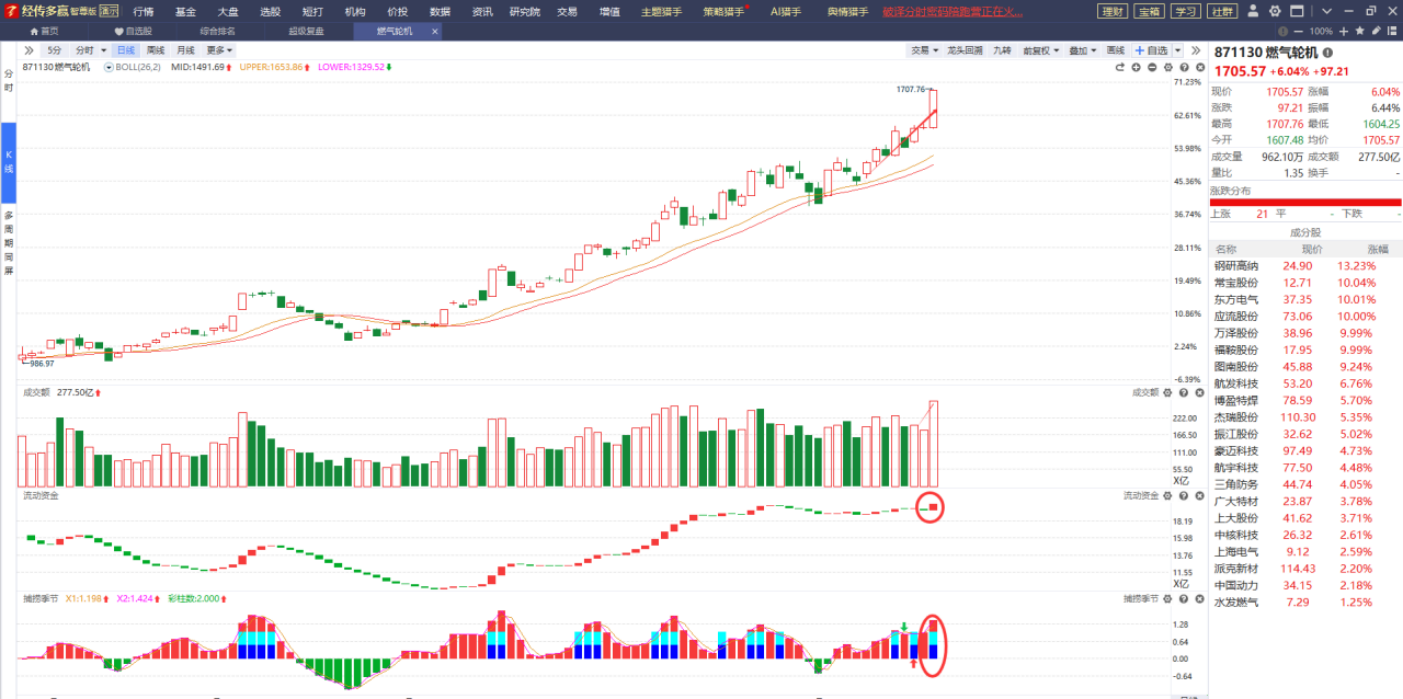 燃气机方向近期的走势特别强,主要得益于“量价齐升”。从目前各指标的表现情况来看,它依然处在比较健康的状态,那么很大概率这种向好的趋势会持续下去。手中持有相关个股的继续拿着就行了,切勿追高买入。