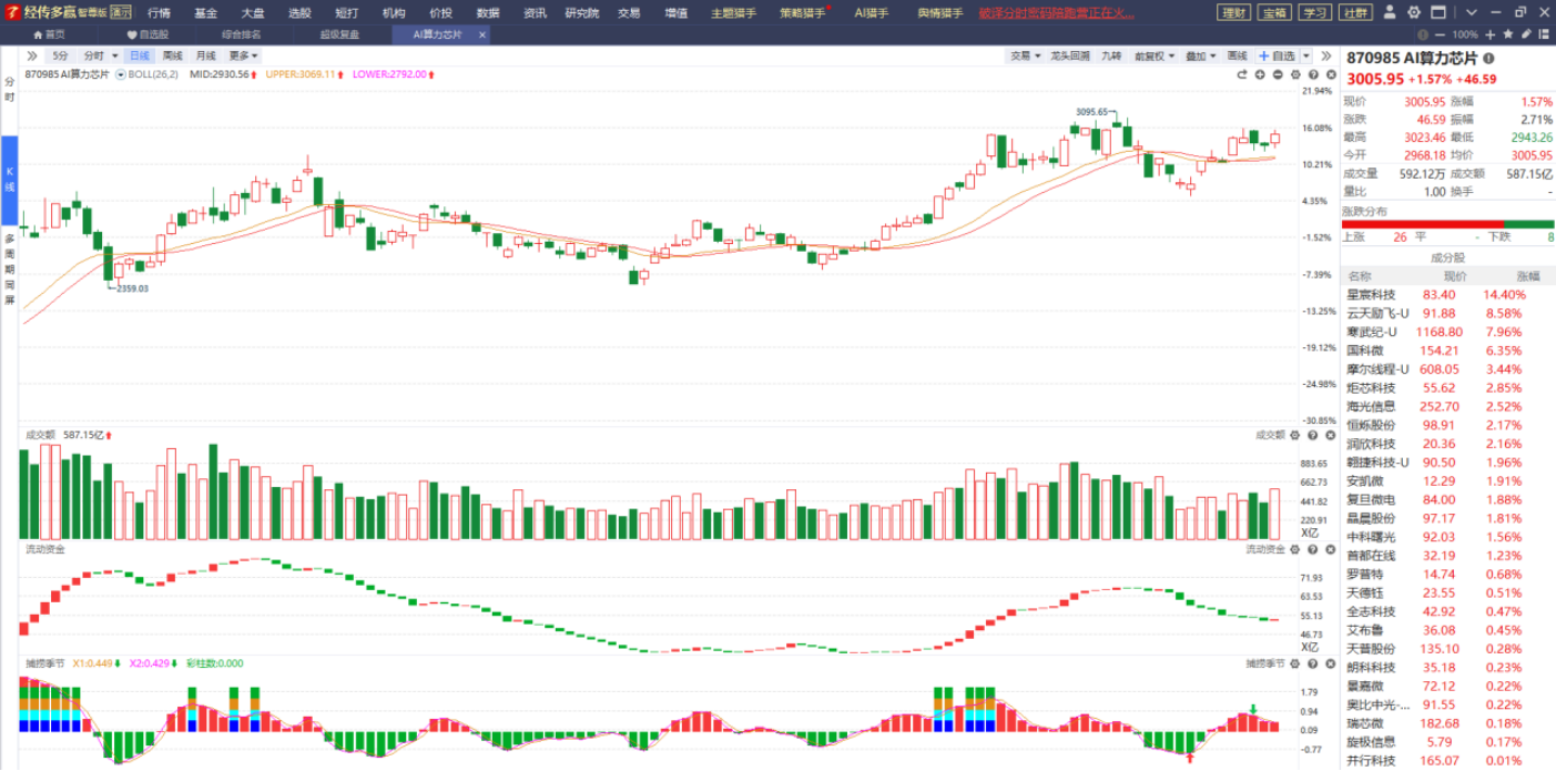 科技方向昨天的强势表现带动了一系列与之相关的板块走强,其中AI算力芯片也走出了止跌企稳反弹的走势,而且它的成交额呈放量状态,流动资金开始翻红,指标方面也呈现“弱转强”初期的状态,只要趋势不破就可以持续关注,市场炒作“老登”方向已经有一段时间了,也该换一换风格了,那么科技方向会不会成为市场接下来重要的炒作方向呢?值得期待!