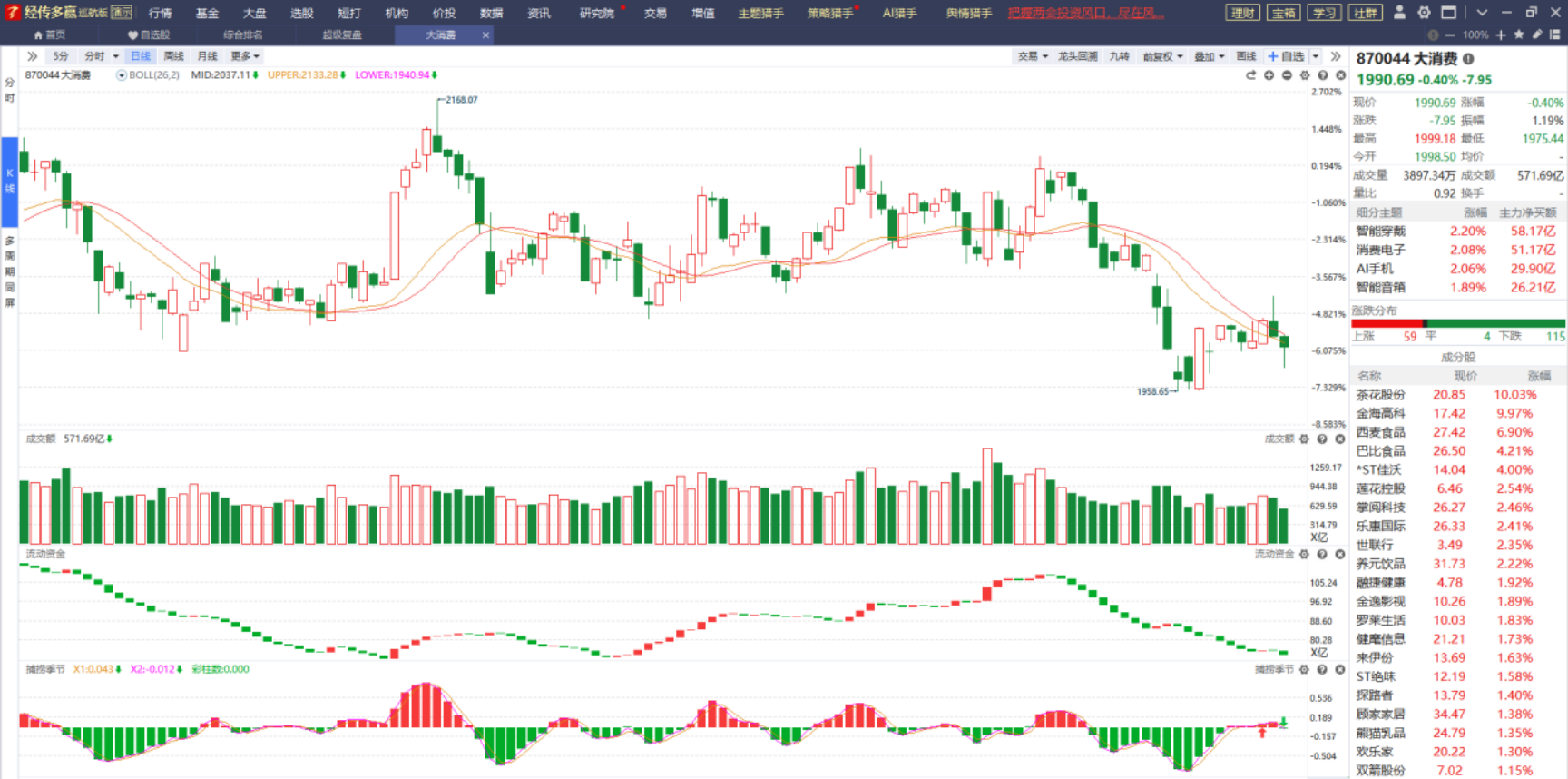 酒店餐饮板块这两天有点蠢蠢欲动的意思,它的异动有可能带动大消费板块的异动,从目前大消费板块的表现来看,它在辅助线下方探底回升收出一根“大长腿”,是否意味着有可能止跌企稳呢?现在的市场只能去寻找一些低位有上涨潜力的方向去潜伏,只能去博它的反弹上涨行情,只有这样才有可能在这个震荡市赚到收益。
