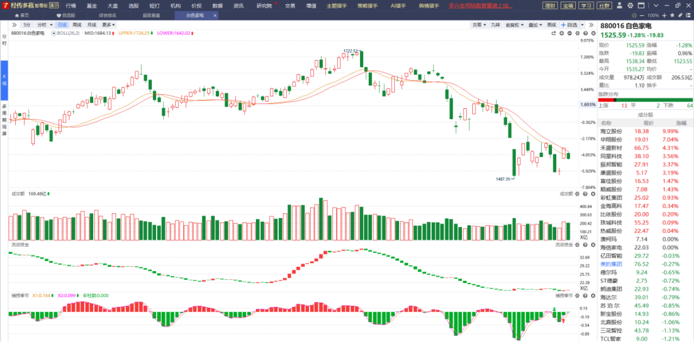 家电板块在周三市场普涨的背景下迎来大幅跳空高开行情,说明该板块在长期的压制下已具备超跌反弹的潜力,目前它的各项指标都出现了弱转强的迹象,只要市场情绪能有所好转,它就有机会迎来上涨行情,对该方向感兴趣的可以逢调整时低吸进场。