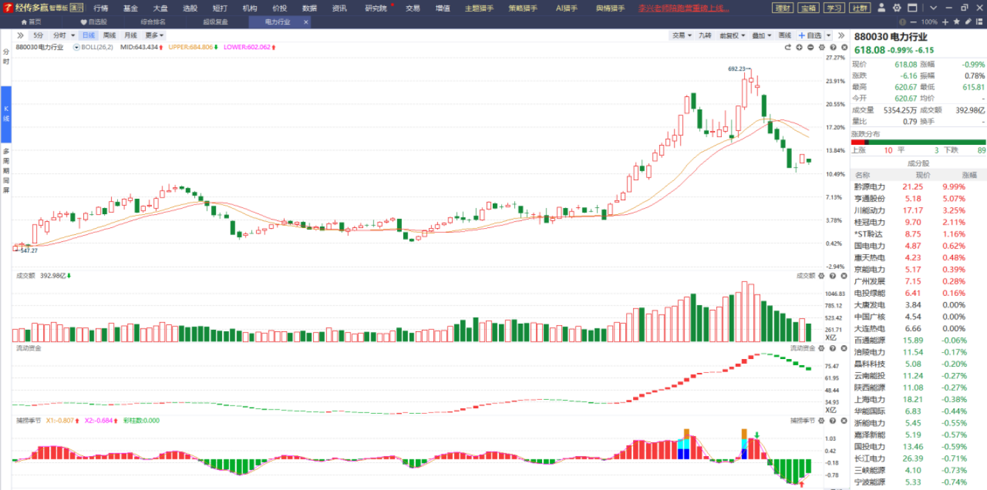 电力板块经过前期大幅调整之后,目前在相对低的位置止跌企稳然后窄幅震荡,现在就等更多好转信号的出现以及市场重新出现积极的看多情绪,届时它有可能会酝酿出一波大的反弹行情。
