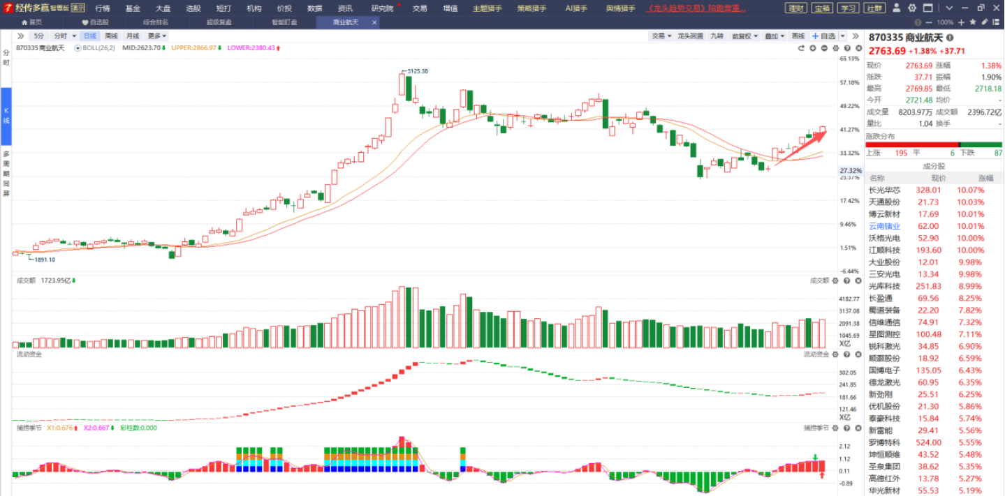 商业航天板块自从突破并站上辅助线之后,它的趋势一直保持得不错,成交额呈逐渐放量状态,流动资金持续翻红,捕捞季节收出金叉,可趁它在调整的时候积极布局。