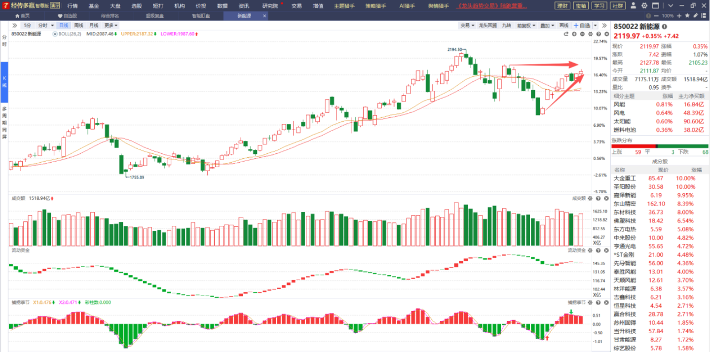 新能源板块近期的走势也非常不错,处于行情刚刚启动阶段,但它目前面临上方反弹的压力也比较重,看市场接下来是否会延续积极向好的走势,若市场能保持向好状态则它有可能突破反弹压力位,若对该方向感兴趣的可以在它突破不上去被打压下来时逢低介入。