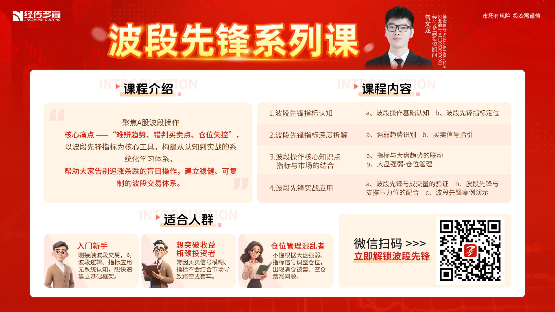 在认知层面,它带你了解波段操作基础,明确波段先锋指标定位;深度拆解指标,教你识别强弱趋势,指引买卖信号。到了实战环节,你能学会将指标与大盘趋势联动,根据大盘强弱进行仓位管理,还能看到波段先锋与成交量验证、和支撑压力位配合的实操,更有案例演示,手把手教你应用。