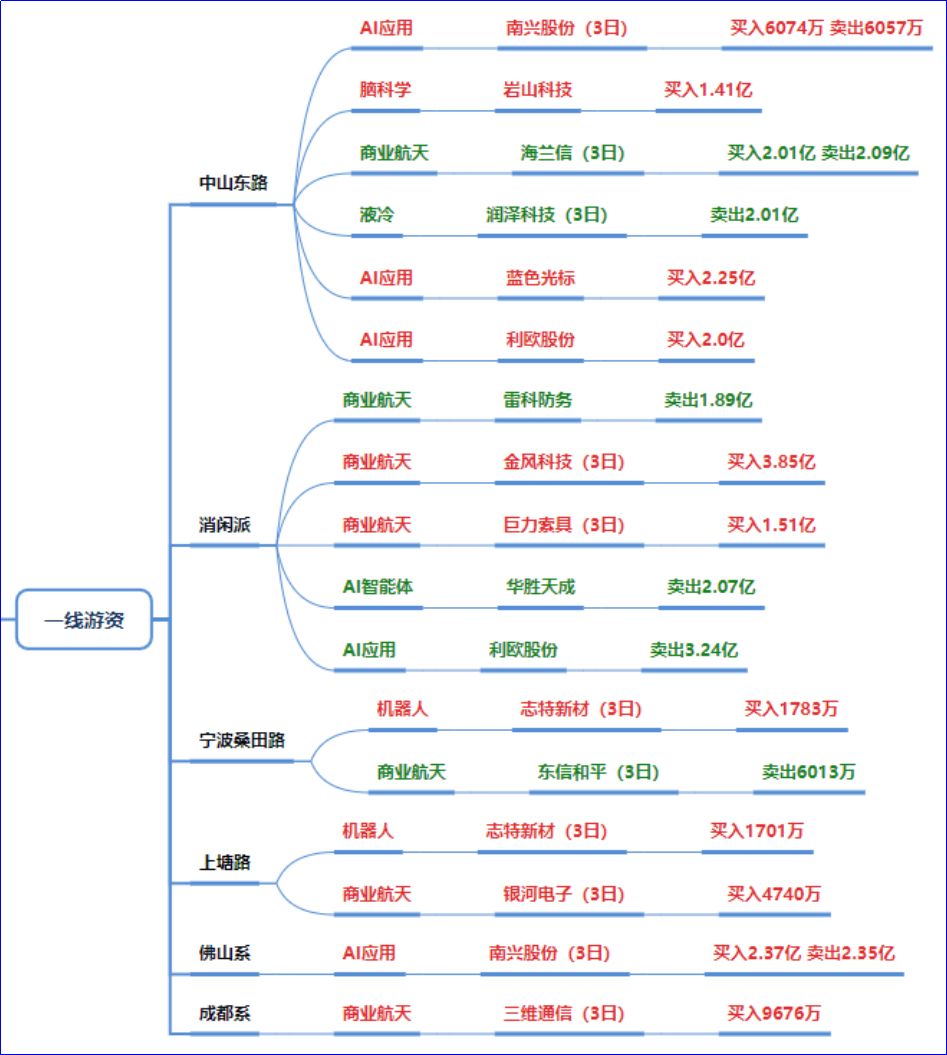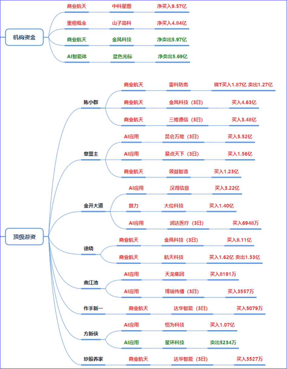 多个顶级游资(陈小群、徐晓、作手新一、炒股养家、消闲派等)集中买入该板块,仅金风科技就获陈小群(4.63亿)、徐晓(8.11亿)、消闲派(3.85亿)合计超16亿买入;达华智能、三维通信等标的也获多路游资加仓。同时出现部分兑现(如雷科防务、航天科技、海兰信的卖出),但买入力度远大于卖出,属于分歧中买入的强主线特征。板块地位:当前市场第一主线,资金集中度高、承接力强。