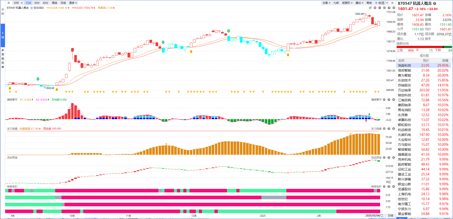 从软件指标来看,机器人在连续调整多日后回档智能辅助线全面反弹,但流动资金翻绿+主力控盘下降说明主力资金承接不足,今天的反弹更多是消息刺激,有持仓的朋友注意好去弱留强,没有持仓的朋友则等待捕捞季节强势金叉后再进场更好。