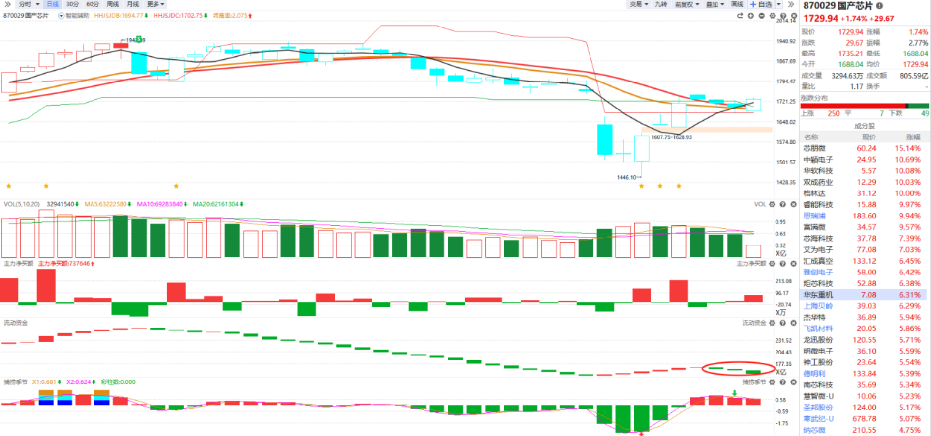 从软件信号看,半导体板块位于智能辅助线附近震荡,流动资金近期翻绿,板块整体性机会还没有出现,今日领涨是模拟芯片细分领域,涉及基本面相关的行业核心标的今日震荡新高,模拟芯片相关概念个股分时均价线之上运行,捕捞季节没有死叉信号则顺势坚持,对于流动资金持续翻绿的个股则短期容易遇到板块分化承压。
