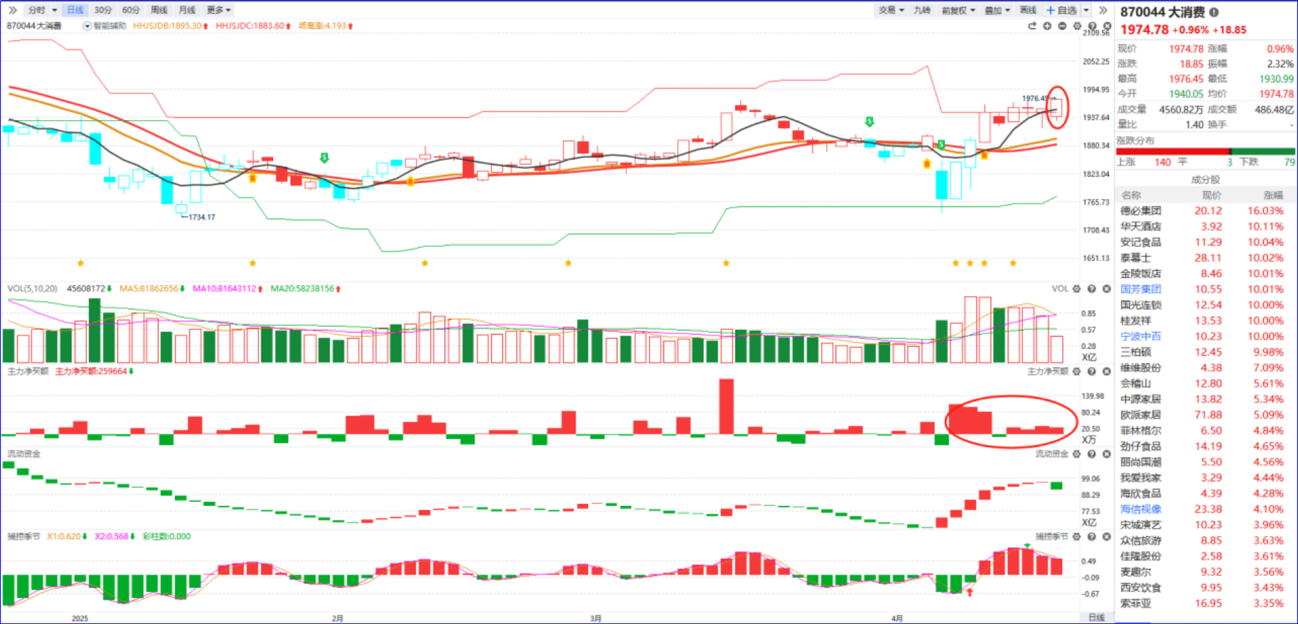 从软件信号看,消费板块位于智能辅助线之上,近期主力净买额和流动资金翻红为主,今日消费板块震荡几天以后阶段新高,高标普遍连板晋级,成功兑现板块分歧2-3天以后低吸低位+主力净买额红肥绿瘦的活跃个股等待拉升的操作方案。接下来注意高标能否持续连板,主力净买额红柱高度能否到前期位置,若有走弱迹象,个股则适当做好仓位管理。