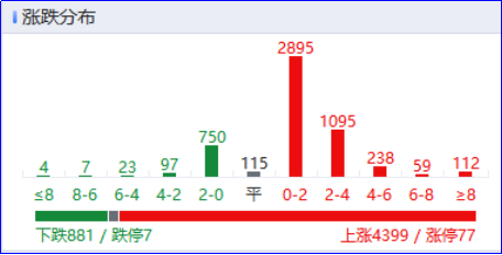市场早盘低开后震荡反弹,三大指数小幅上涨。沪深两市半日成交额6173亿,较上个交易日缩量604亿。盘面上热点围绕内需和自主可控两个方向展开,个股普涨,全市场超4300只个股上涨。截至收盘,沪指涨0.21%,深成指涨0.42%,创业板指涨0.61%。