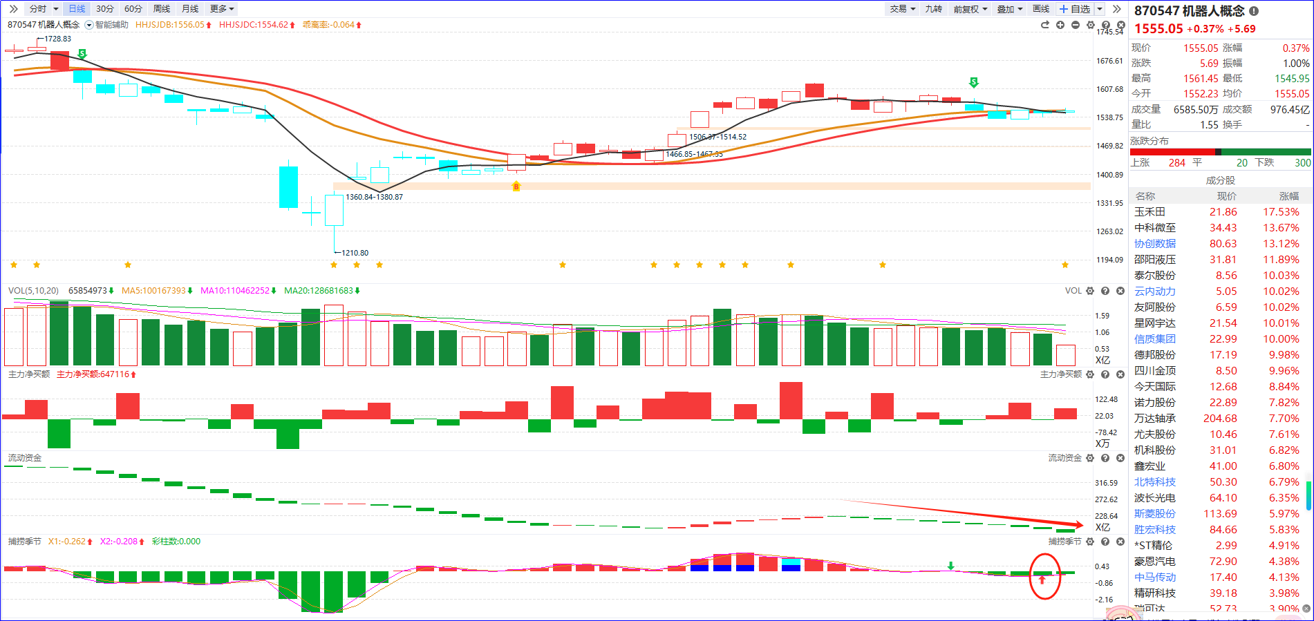 从软件信号看,机器人板块流动资金持续翻绿,作为科技领域的热点方向,是不是会有舆情助力轮动,需要注意,机器人作为机构布局较深的方向,基于市场成交量持续缩量,短期板块较难出现持续性的行情,大部分股票更多是短期捕捞季节金叉的反弹。