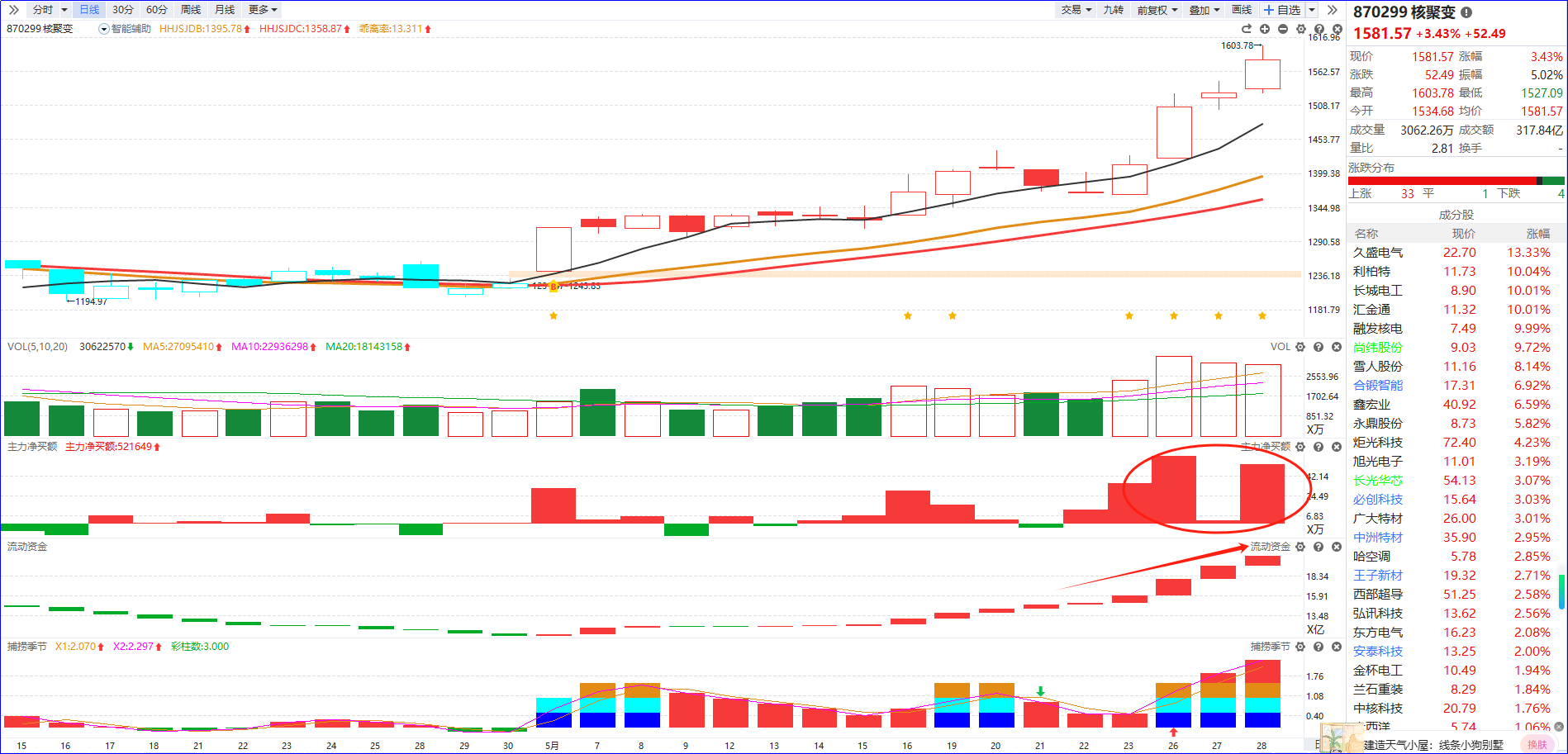 从软件信号看,核聚变流动资金持续翻红,主力净买额再度大幅拉红,已经成为市场上位数不多有延续性的方向,板块高度和连板都有,后续观察5日主力排序靠前+主力控盘递增的个股回档机会。