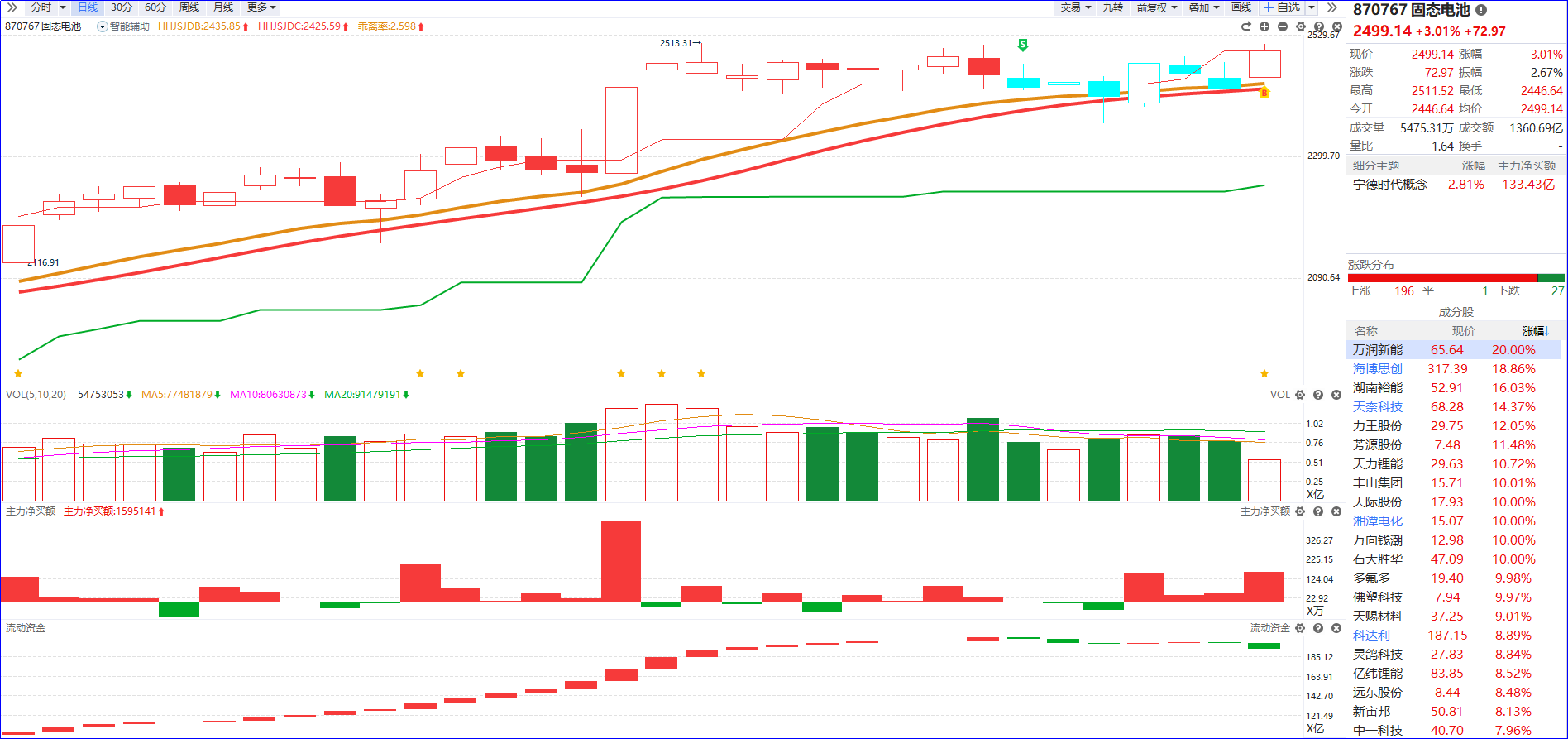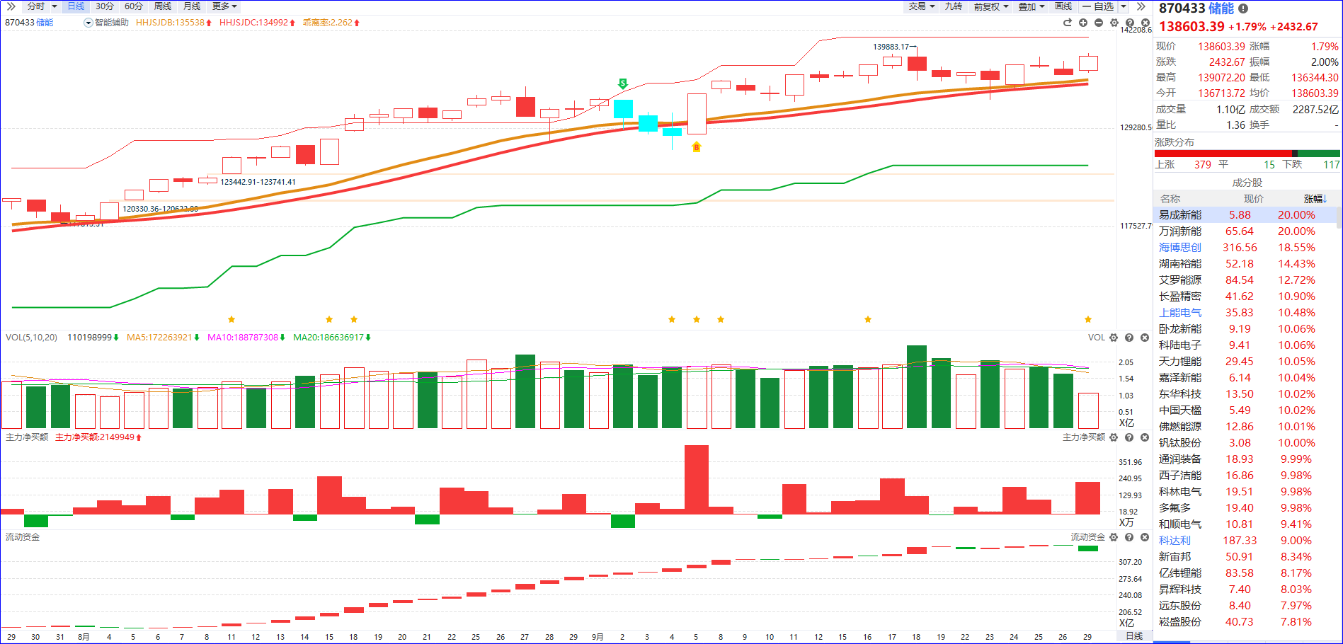 从软件信号看,储能方向近期近期流动资金持续翻红,主力净买额红肥绿瘦,走出震荡上行的趋势。今日板块出现震荡向上,关注5融日主力资金排序靠前,资金趋势始终保持强势、未随板块震荡出现明显流出的个股。