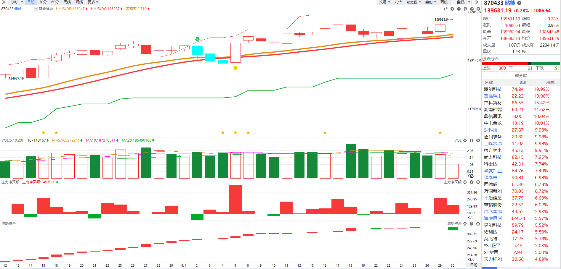 从软件信号看,储能板块近期流动资金翻红为主,显示市场交易热度稳步回升,主力净买额呈现红肥绿瘦格局,表明主力资金对板块的配置意愿明确。在资金强势支撑下,板块已依托金叉信号突破前期横盘平台,后续能否延续震荡上行趋势,需重点关注两个关键信号:一是突破后量能能否温和放大(量能与股价形成正向配合,验证突破有效性);二是首次回踩时能否守住关键支撑位(如突破平台上沿或短期均线)。若两大信号均得到满足,板块上行空间将进一步打开。