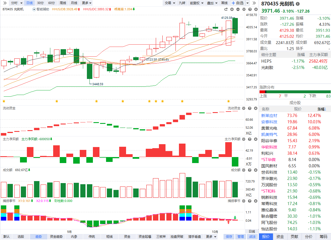 消息面上,10月10日,深圳市政府新闻办新闻发布会举行。深圳市发展和改革委员会主任郭子平介绍,深圳半导体企业新凯来将亮相"湾芯展"。