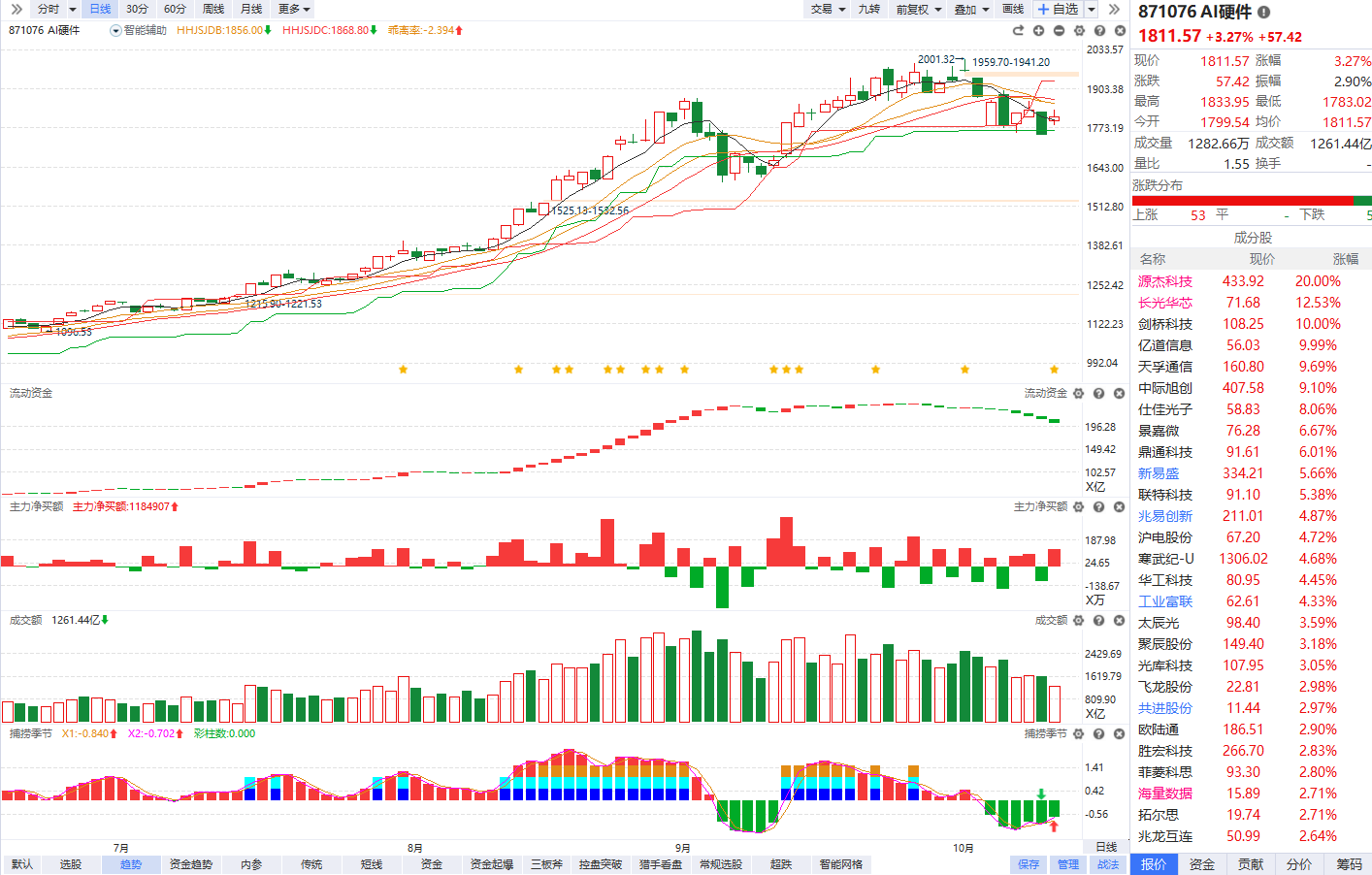 根据软件信号,板块近期流动资金持续翻红,主力净买额红肥无绿,近期刚刚放量突破横盘平台,仍然处在相对低位,在高位科技题材分歧持续加大,连续滞涨分化的背景下,有望会成为高低切换的方向,突破平台后的首次死叉回档具备短线性价比。