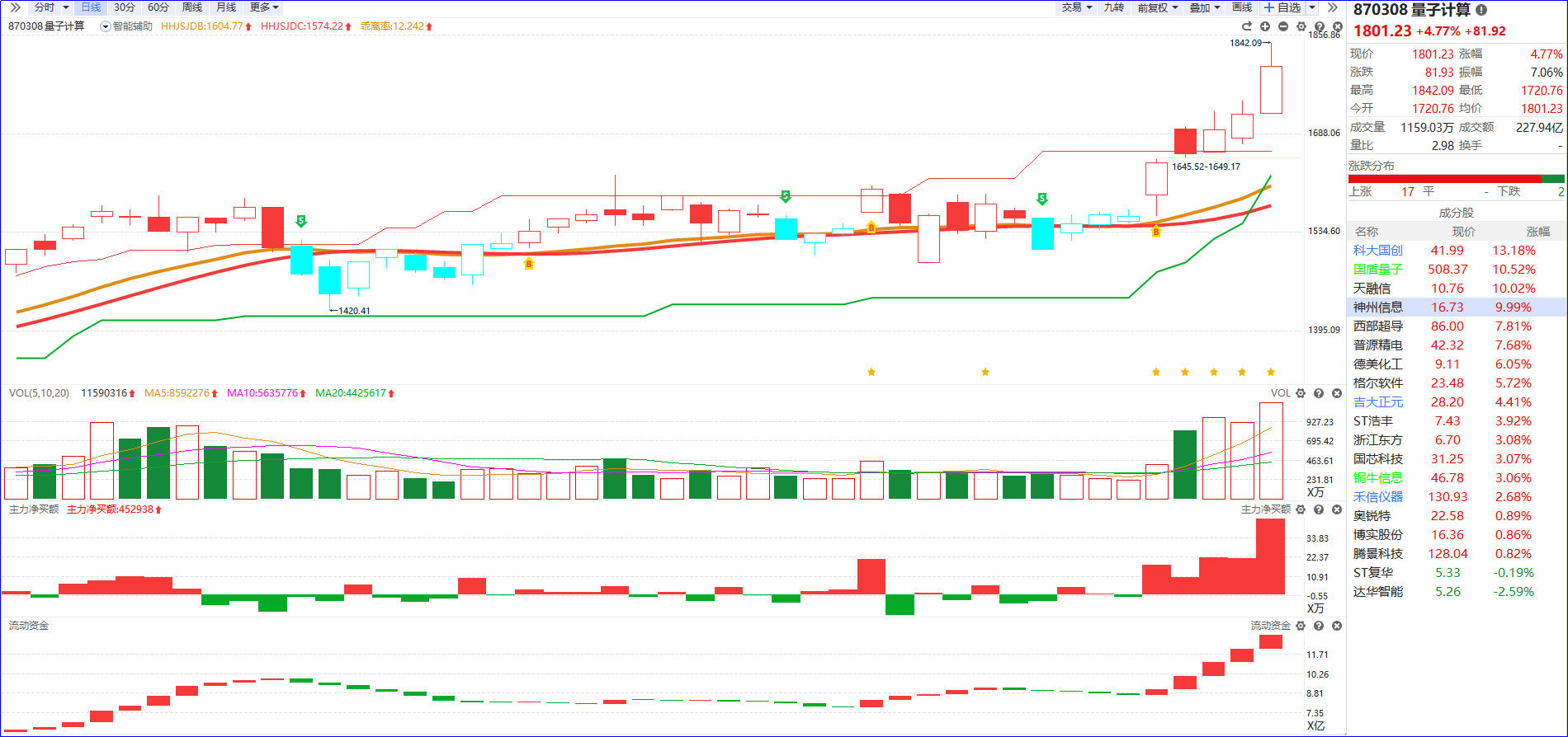从软件信号看,量子计算板块近期呈现积极的资金特征,流动资金持续翻红,主力净买额红肥绿瘦态势稳定,资金承接力度较强。技术面来看,板块近期已实现放量突破前期震荡平台,短线趋势正式进入突破阶段,且已连续多个交易日保持反弹节奏,市场做多动能得到有效释放。不过需理性看待当前行情:在短线连续急涨并迎来情绪高潮后,板块已显现分化需求,后续波动概率将显著提升。操作层面建议回避高位追涨风险,耐心等待首次回档调整后的博弈节点,待资金重新凝聚方向后再择机布局,以更稳健的姿态把握板块趋势性机会。