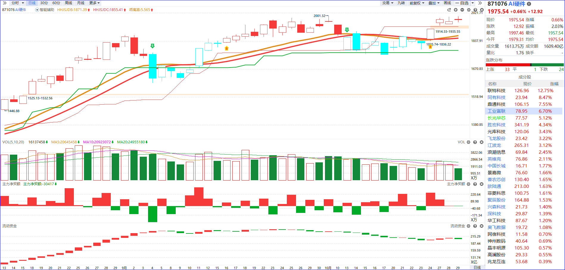 从软件信号看,近期AI硬件板块资金面表现亮眼,流动资金以翻红为主,主力净买额延续红肥绿瘦的积极态势,资金高度集中于具备清晰产业逻辑、且订单规模超市场预期的少数龙头企业。其中,中际旭创、新易盛、工业富联等代表性标的持续突破前期高点,彰显板块核心资产的配置价值。不过需注意,当前板块整体上涨强度相对温和,且在前期积累了较多获利盘的背景下,多只个股已出现冲高回落的震荡调整信号,短期需警惕获利回吐压力。展望后续,随着板块流动资金持续保持翻红状态,这一信号将直接推动市场资金活跃度与整体做多情绪显著回升。从资金轮动规律来看,后续板块内的赚钱效应有望突破当前少数龙头独强的格局,逐步向更多具备业绩支撑或技术壁垒的标的扩散,为板块带来更广阔的结构性机会。