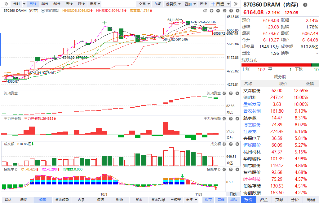 消息面上,11月5日,SK海力士表示,已与英伟达就明年HBM4的供应完成了价格和数量谈判。一位熟悉SK海力士的消息人士称:“HBM4的供应价格将比HBM3E高出50%以上。隔夜美股存储板块大涨,希捷科技和闪迪周三双双涨超10%,美光科技涨近9%,西部数据涨超5%。