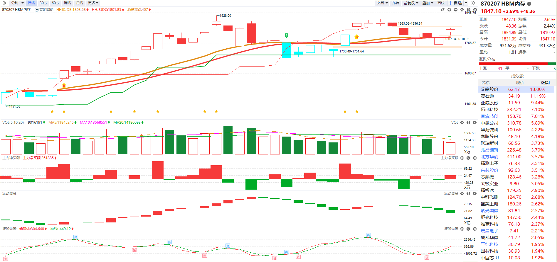 从软件信号看,存储芯片板块近期资金面呈现明显分歧:流动资金持续处于翻绿状态,虽主力净买额整体呈现红肥绿瘦的格局,K线图为回档反弹走势,但板块资金活跃度始终偏低,核心问题在于缺乏增量资金进场承接,反弹动能后续大概率承压。节奏看,当前反弹若触及前期低开缺口的压力位,板块容易再次陷入承压分化行情。操作上需重点规避高位追涨风险,一旦60分钟级别出现顶背离信号,建议及时收缩仓位。