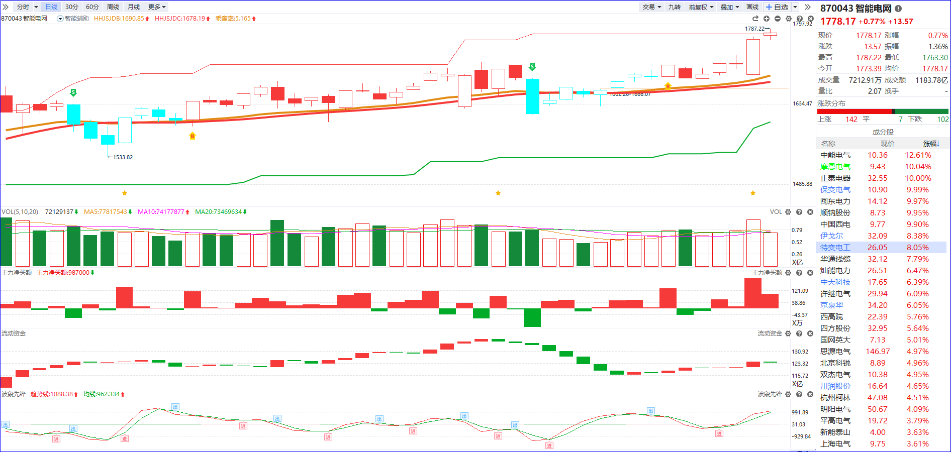 从软件信号看,智能电网板块近期资金面已现积极信号:流动资金率先翻红,主力净买额同样保持红肥绿瘦,且昨日与大盘指数形成共振爆发。从板块轮动逻辑看,当前高位科技板块普遍进入滞涨阶段,资金高低切换需求显著,而智能电网板块因位置相对低位,成为资金转移配置的重要方向。板块突破前期横盘整理平台后,首次出现的死叉回档走势,并未破坏整体上升结构,反而为短线布局提供了具备性价比的进场机会,后续可重点关注5日主力排序靠前的个股中,回档后的承接力度与反弹动能。