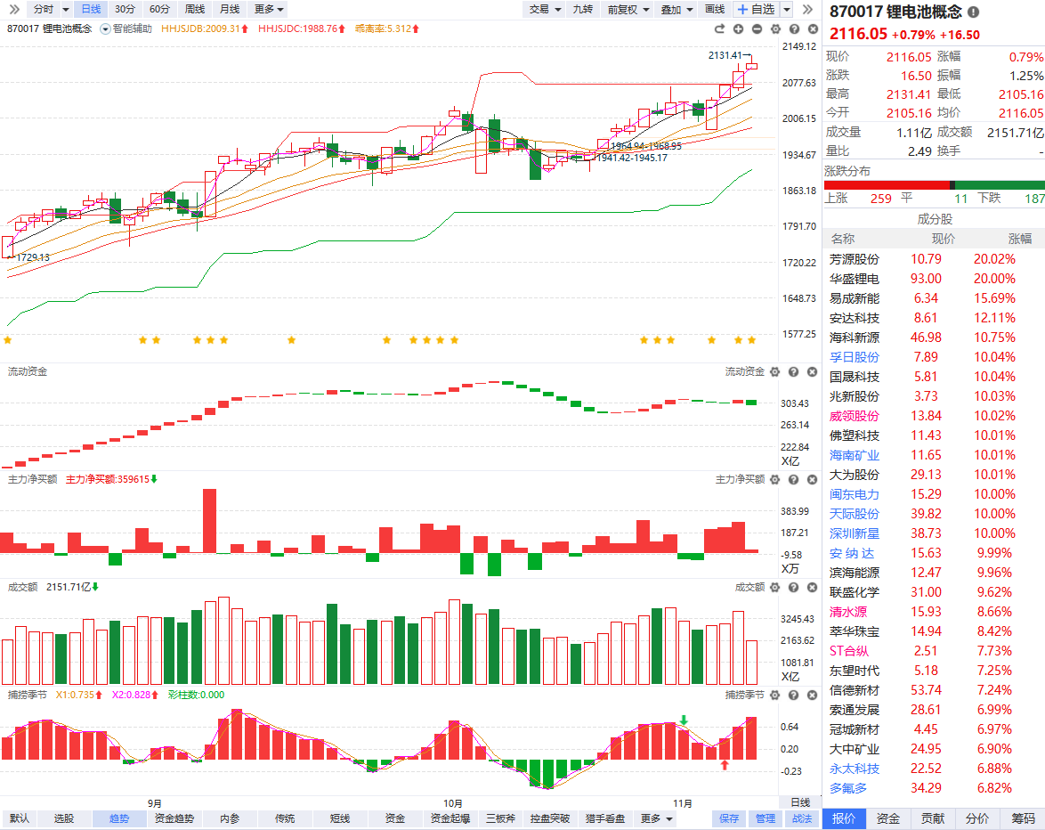 消息面上,Wind市场监测数据显示,10月1日—11月7日,六氟磷酸锂价格从6.1万元/吨迅速拉升至12.15万元/吨,一个多月内涨幅高达99%,创下近期新高。