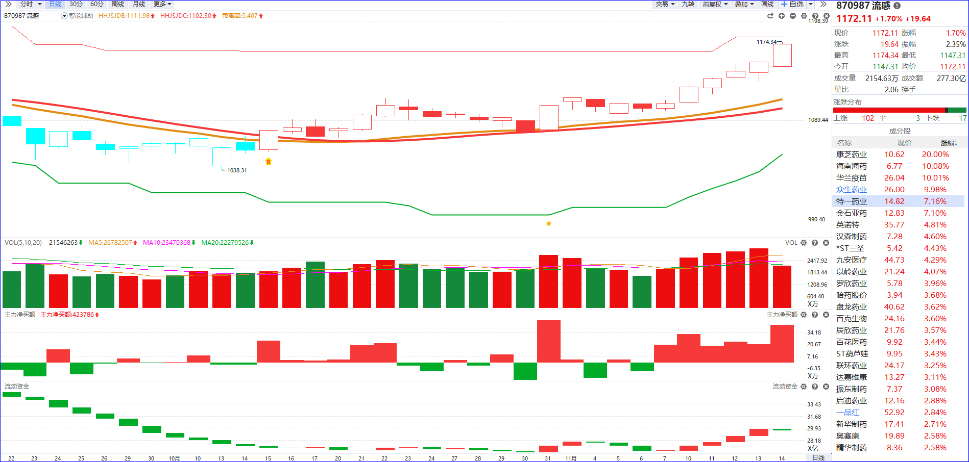 从软件信号看,流感概念呈现出显著的强势特征,近期流动资金持续翻红,主力净买额更是保持红肥无绿的格局,资金做多意愿极为坚定。在强劲资金支撑下,板块已走出突破前期平台后的连续阳线上攻走势,强趋势形态完全确立。从操作节奏来看,只要板块内前排连板先锋标的能够持续打开高度,维持板块热度,那么后续板块缩量回踩5日均线,或是出现60分钟级别的回档节点时,仍具备较高的短线博弈性价比。