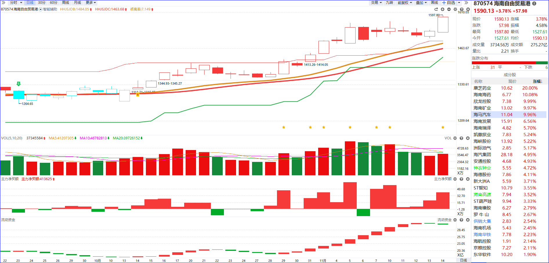今日上午海南自贸概念反复走强,海马汽车走出11天7板,此前海南海药、欣龙控股涨停,洲际油气、海南瑞泽、凯撒旅业、海南矿业跟涨。