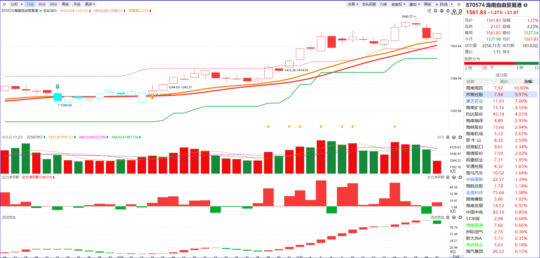 依据软件信号分析,海南概念近期流动资金持续翻红,显示板块短期交易热度始终在线;主力净买额同样维持红肥绿瘦。在此资金强势背景下,板块经历短暂缩量回踩辅助线后,迅速走出止跌反弹阳线,不过需警惕若反弹过程中流动资金未能延续翻红态势,意味着短期交易热度开始衰减,此时需把握逢高兑现机会。