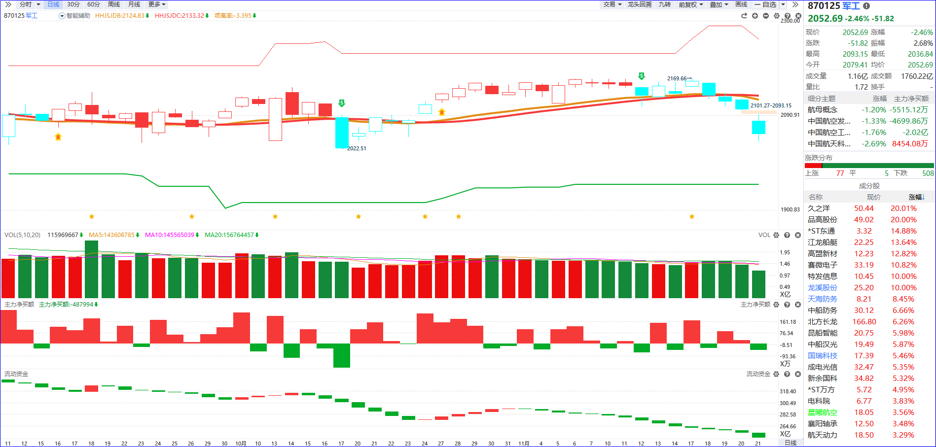 从软件信号看,军工流动资金持续翻绿,主力净买额呈红肥绿瘦,部分资金已现活跃迹象但未大幅流入,板块尚不具备整体性行情,期间多为舆情消息刺激,活跃资金更多聚焦5日主力排序靠前+流动资金翻红的人气股。
